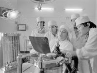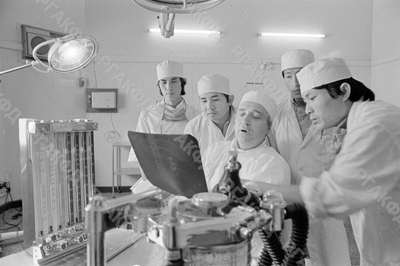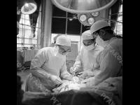 1-119240-ч/б Вьетнамский хирург, доктор медицины, профессор, Герой Социалистического Труда СРВ, иностранный член АМН СССР Тон Тхат Тунг (слева) и др. во время операции в Центральной больнице имени Вьетнамо-Германской дружбы в г.Ханое. Вьетнам Северный (ДРВ), г.Ханой. 01.08.1970г. Фот. Фот. Соболев В.