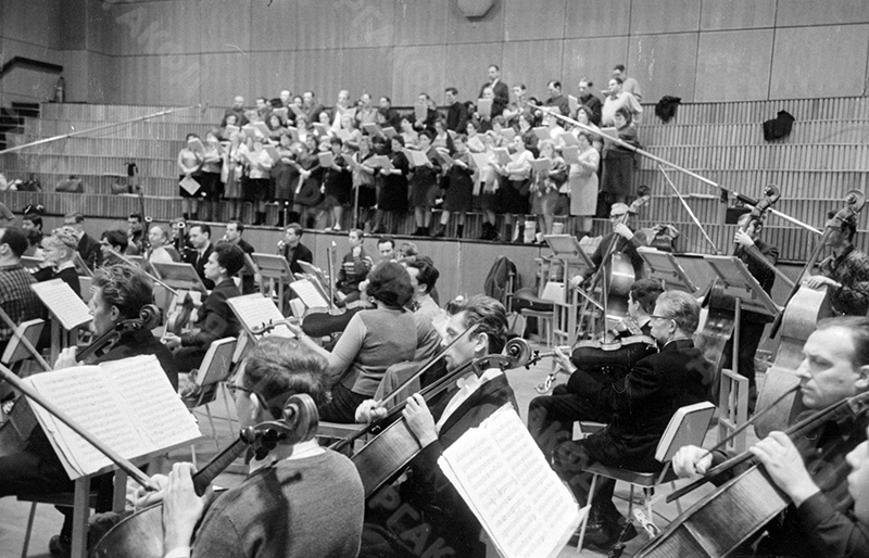 0-393876-ч/б Виолончелист М.Л.Ростропович в сопровождении Большого симфонического оркестра Всесоюзного радио и Центрального телевидения под руководством главного дирижера Г.Н.Рождественского во время репетиции на сцене Московской консерватории имени П.И.Чайковского. СССР, г.Москва. 1970-1974гг. Фот. А.Н.Агеев.
