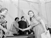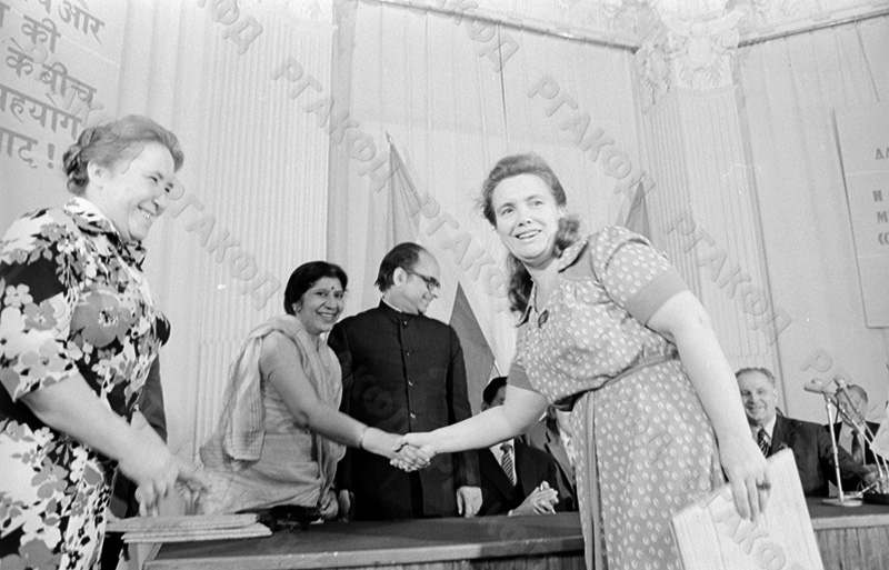 0-394226-ч/б Представитель индийской стороны общества советско-индийской дружбы (в центре) поздравляет главного редактора журнала "Советская женщина" В.И.Федотову (справа) с почетным дипломом и медалью лауреата премии имени Джавахарлала Неру в Доме дружбы с народами зарубежных стран (ныне Дом приемов Правительства Российской Федерации). Слева - председатель президиума Союза советских обществ дружбы и культурных связей с зарубежными странами З.М.Круглова. СССР, г.Москва. Январь 1976г. Фот. Годунов А.