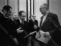 0-394231-ч/б Чрезвычайный и Полномочный Посол Испании в СССР Хуан Антонио Самаранч (в центре), советский писатель С.В.Михалков (справа) и др. во время беседы на собрании в Доме дружбы с народами зарубежных стран (ныне Дом приемов Правительства Российской Федерации) в честь первой годовщины установления дипломатических отношений между Советским Союзом и Испанией. СССР, г.Москва. 08.02.1978г. Фот. Бутеев И.