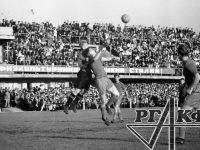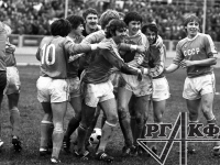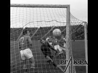 Момент матча за бронзовые медали XX летних Олимпийских игр между сборными командами СССР и ГДР. Среди присутствующих: нападающий О.В. Блохин (СССР), забивший первый мяч в ворота противника, вратарь команды ГДР Ю. Крой и игрок команды ГДР [Ф. Ганзера] (справа).