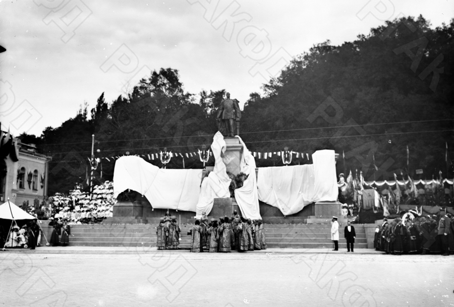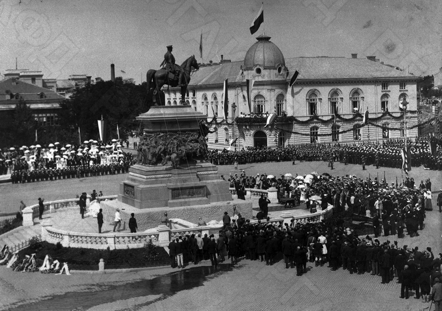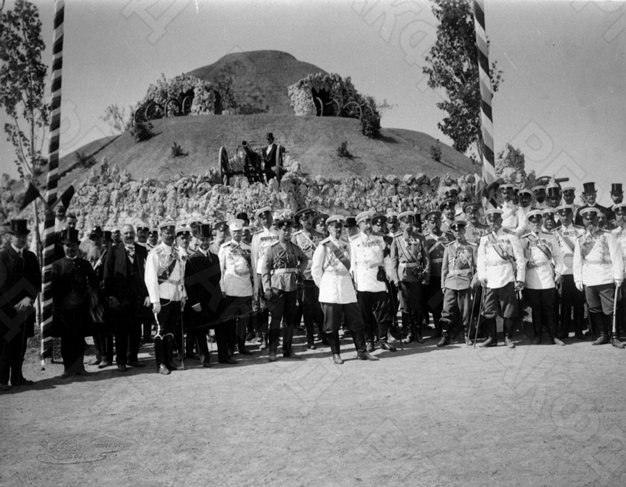 Русская депутация, прибывшая на открытие музея в память войны 1877–1878 гг., на общей могиле-памятнике погибшим воинам. Среди присутствующих (в первом ряду): великие князя Владимир Александрович, Андрей Владимирович, генерал А.П. Струков, генерал П.Д. Паренсов, болгарский князь Фердинанд и другие.
