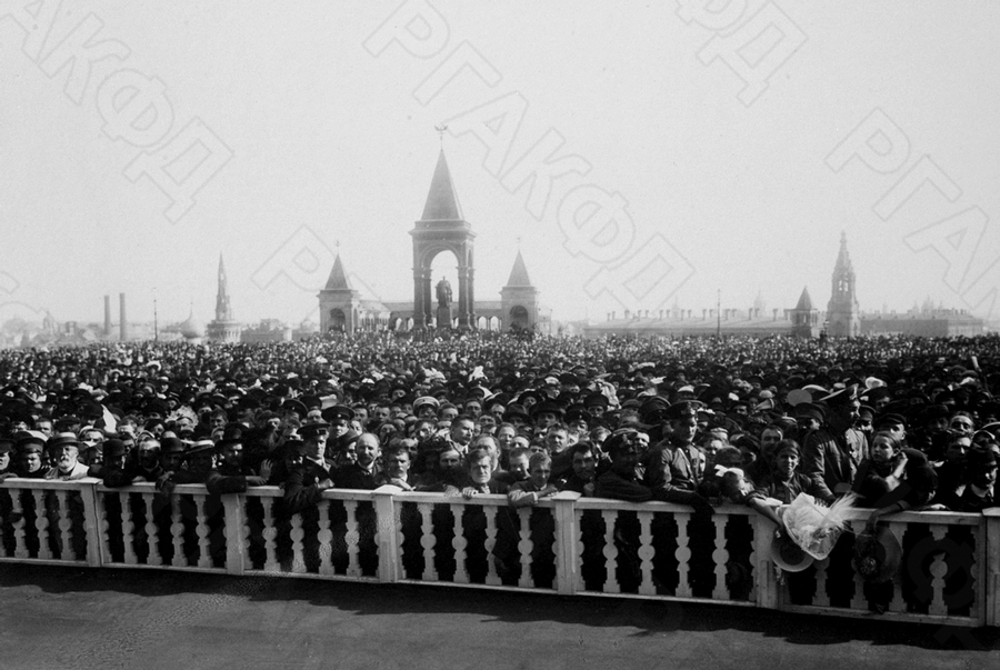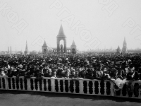 Публика на Соборной площади в Кремле в ожидании высочайшего выхода в Успенский собор в дни торжеств по случаю 100-летия Отечественной войны 1812 года. На втором плане – памятник императору Александру II.
