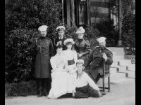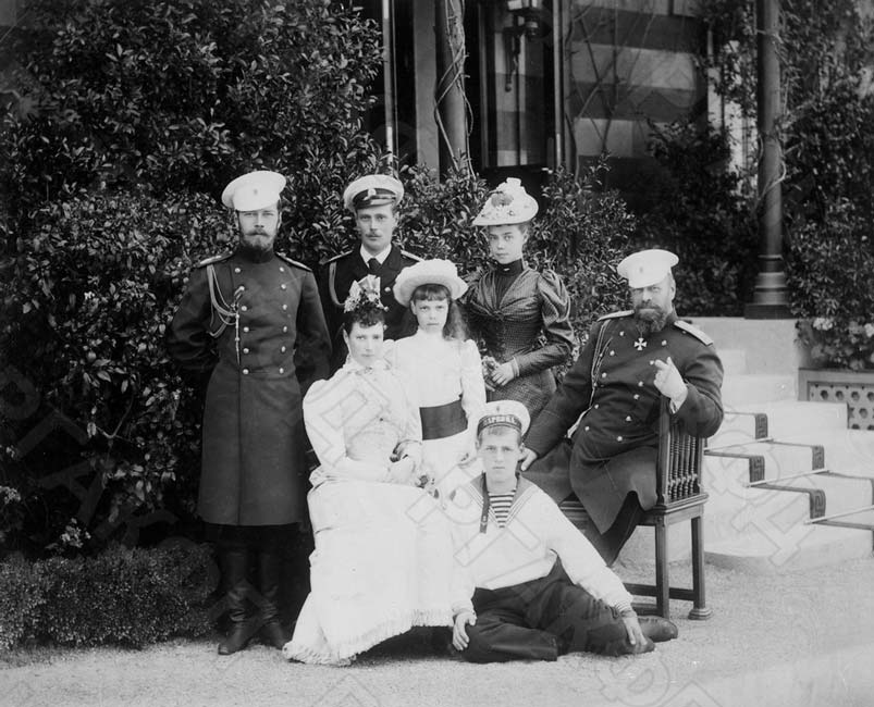 Семья императора Александра III в Ливадии. Стоят (слева направо): цесаревич и великий князь Николай Александрович, великий князь Георгий Александрович, великие княжны Ольга Александровна и Ксения Александровны. Сидят (слева направо): императрица Мария Федоровна, великий князь Михаил Александрович, император Александр III.