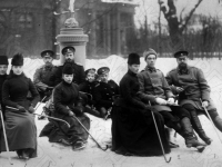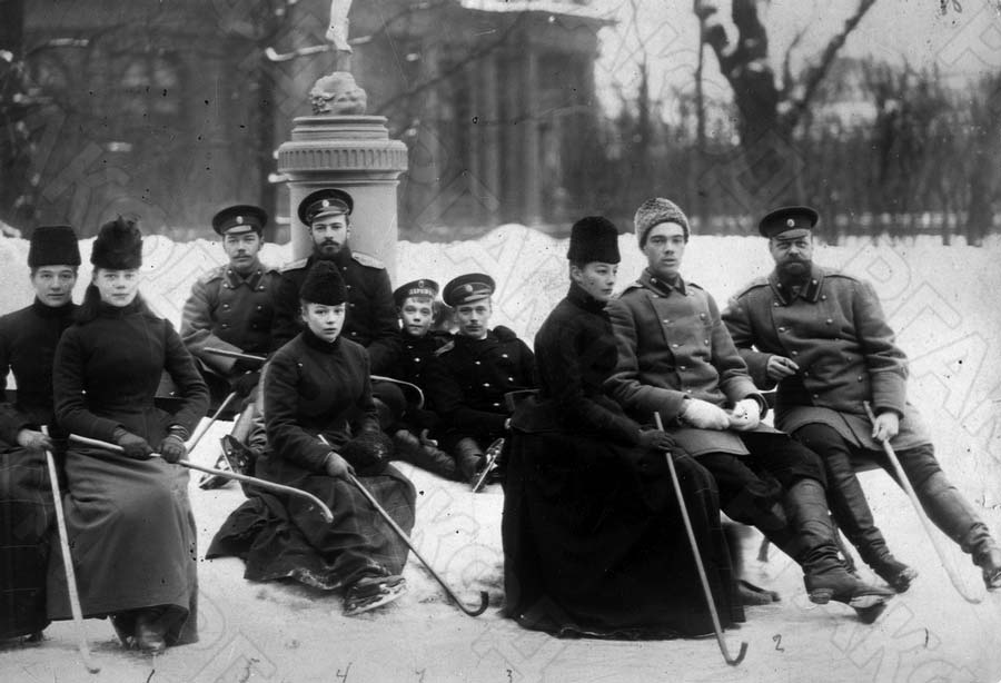 Члены императорской семьи на катке в саду Аничкова дворца. Среди присутствующих: император Александр III, великая княжна Ксения Александровна, цесаревич и великий князь Николай Александрович, великие князья Михаил Александрович, Георгий Александрович, Александр Михайлович и Сергей Михайлович.