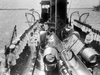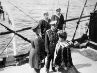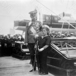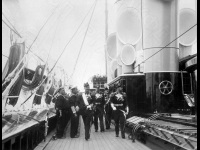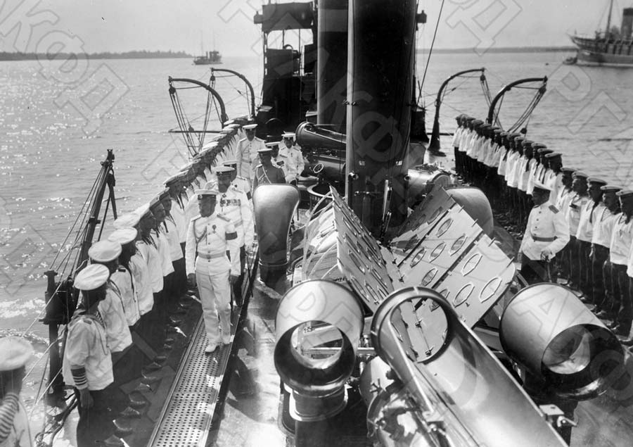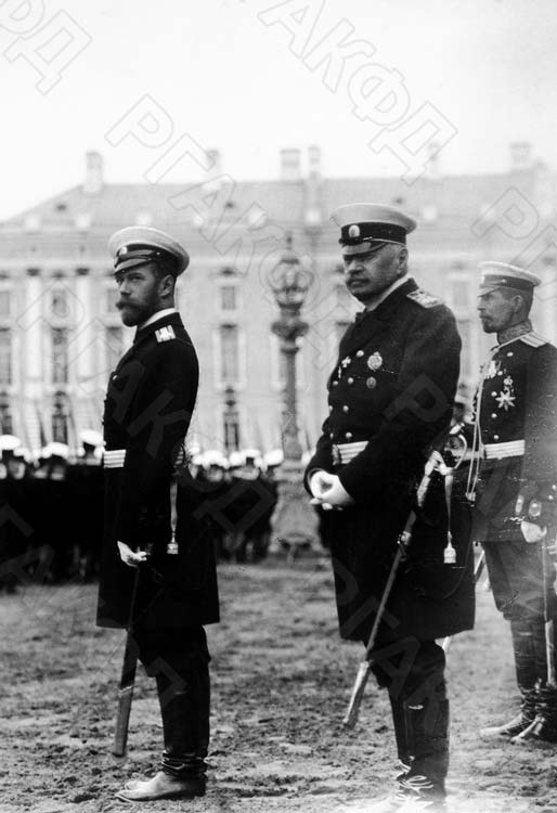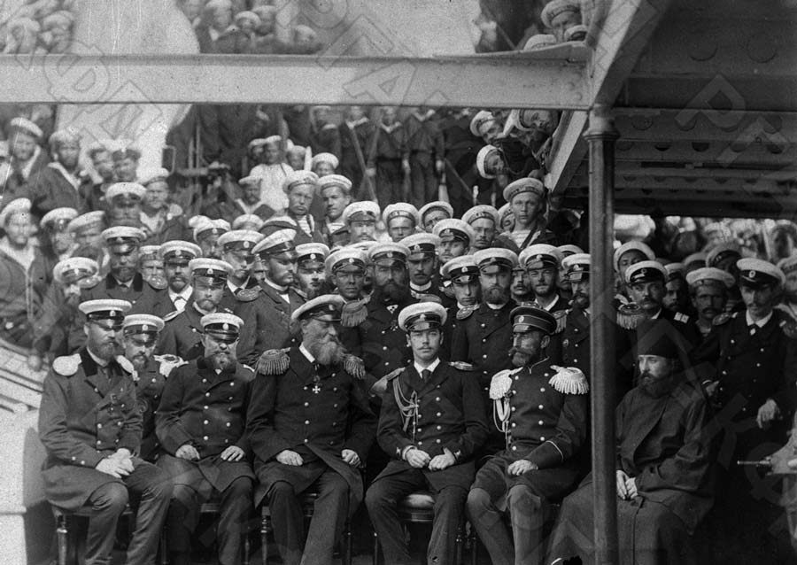 Встреча императора Николая II с германским императором Вильгельмом II на Ревельском рейде. Германский император Вильгельм II (слева), российский император Николай II (справа) и главный начальник флота и морского ведомства великий князь Алексей Александрович во время обхода императорской яхты «Штандарт».