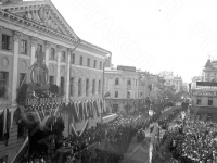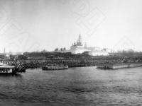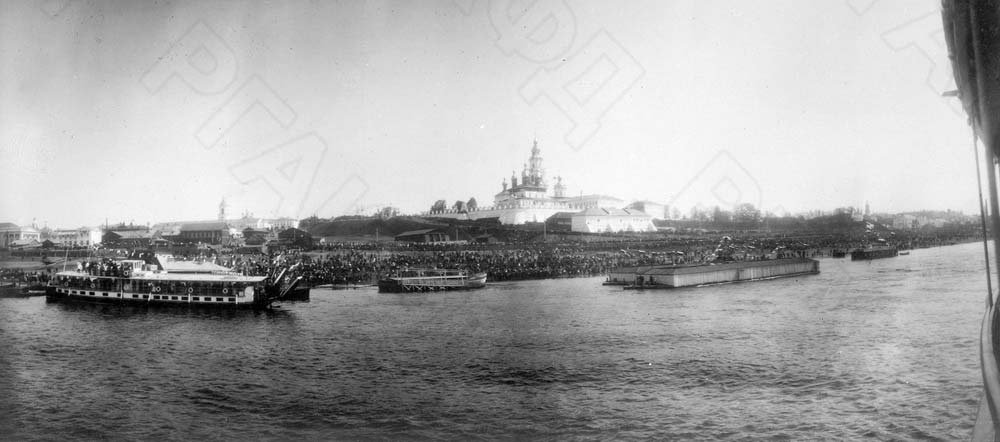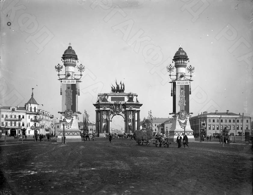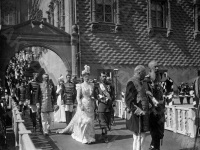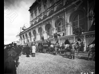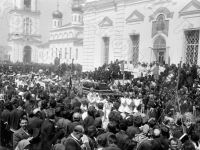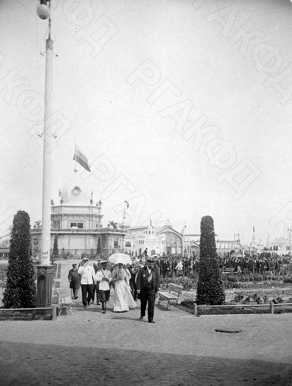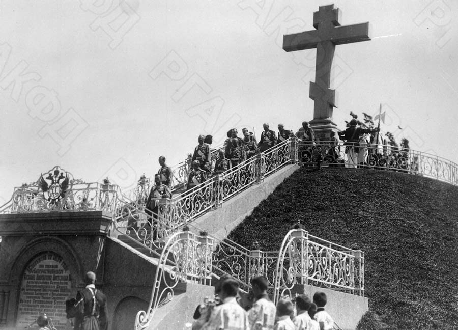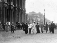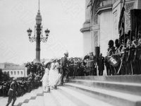 Император Николай II и великие княжны поднимаются в Храм Христа Спасителя в дни торжеств по случаю 100-летия Отечественной войны 1812 года. Высочайших особ встречают генерал барон Ф.Е. Мейендорф и великие князья.