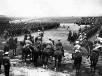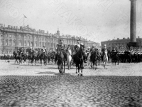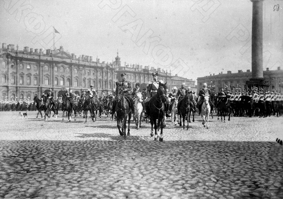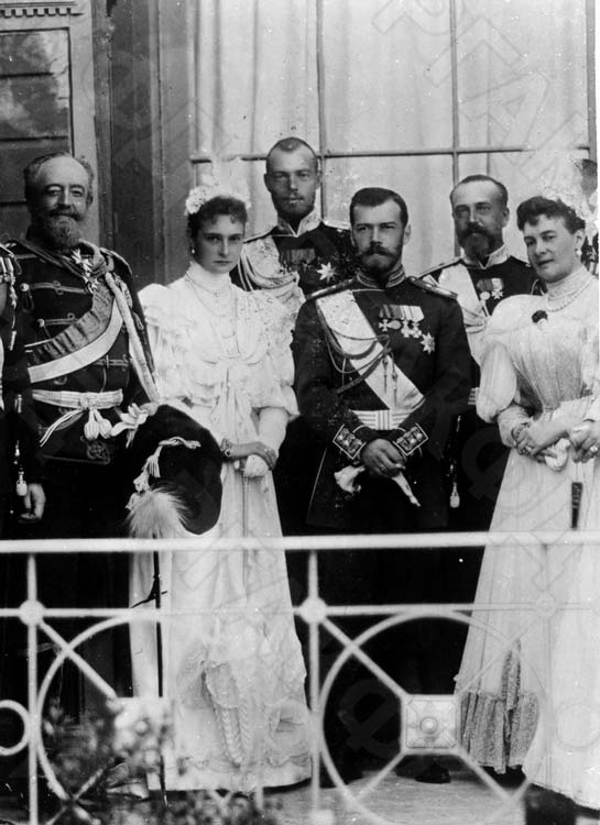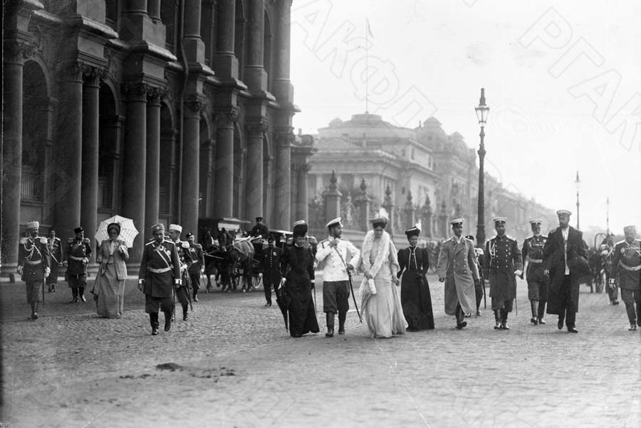Император Николай II и члены императорской фамилии перед Зимним дворцом после приема членов Государственного Совета и Государственной Думы. В центральной группе (слева направо): вдовствующая императрица Мария Федоровна, император Николай II, императрица Александра Федоровна, великая княгиня Ксения Александровна, великий князь Михаил Александрович; первый справа – великий князь Александр Михайлович.