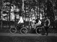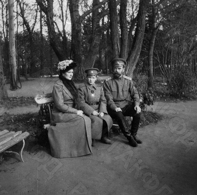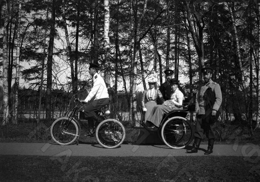 Члены императорской семьи на прогулке в Царскосельском парке (слева направо): великий князь Михаил Александрович, великая княгиня Ксения Александровна с супругом великим князем Александром Михайловичем великая княгиня Ольга Александровна, император Николай II.