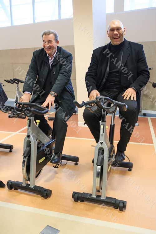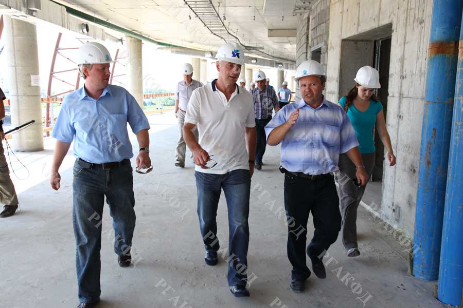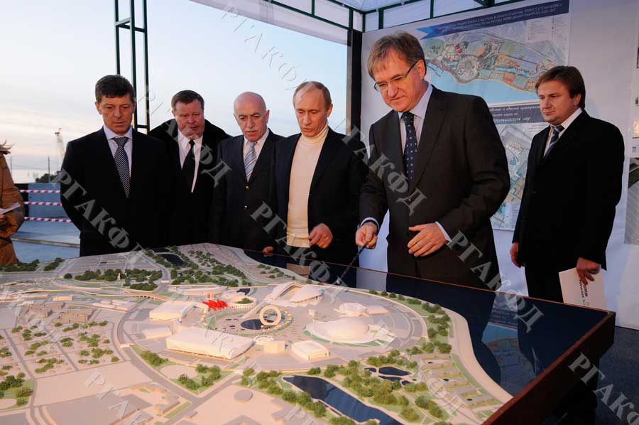 Председатель Правительства РФ В.В. Путин, заместитель председателя Правительства РФ Д.Н. Козак, Полномочный представитель Президента РФ в Южном федеральном округе В.В. Устинов, президент ГК «Олимпстрой» Т.К. Боллоев, главный архитектор ГК «Олимпстрой» О.А. Харченко и др. во время осмотра макета спортивных объектов в Олимпийском парке.