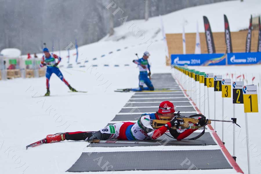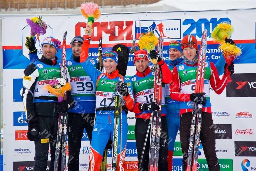 Групповой портрет участников Кубка России по биатлону слева направо: Андрей Прокунин, Анатолий Оськин, Максим Максимов, Сергей Бочарников и др. после завершения соревнований на лыжно-биатлонном комплексе «Лаура».