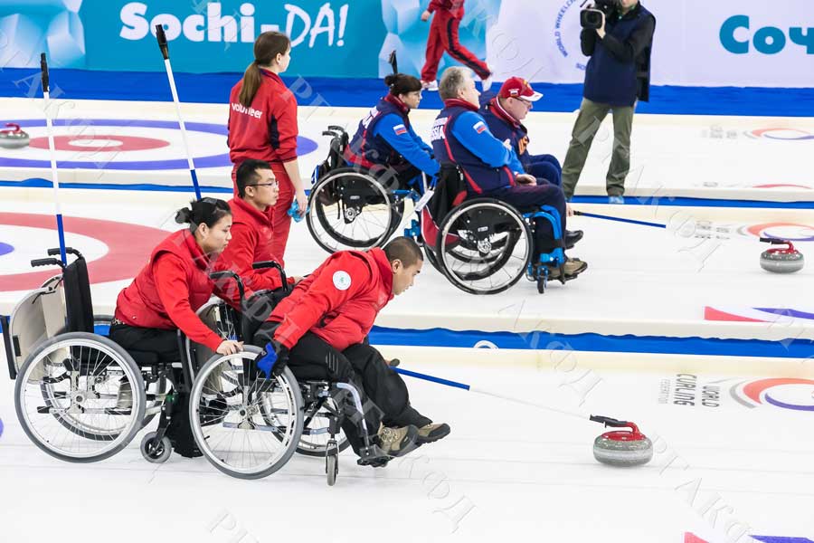 Сборная команда Китая и сборная команда России: Александр Шевченко, Светлана Пахомова и капитан команды Андрей Смирнов во время соревнования между командами России и Китая на Чемпионате мира по кёрлингу среди инвалидов-колясочников в ледовом дворце «Ледяной куб».