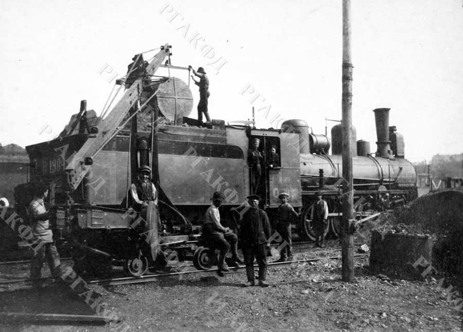 Группа железнодорожных рабочих у паровоза. Российская империя. 1914–1918 гг. РГАКФД. Арх. № П-195-ч/б