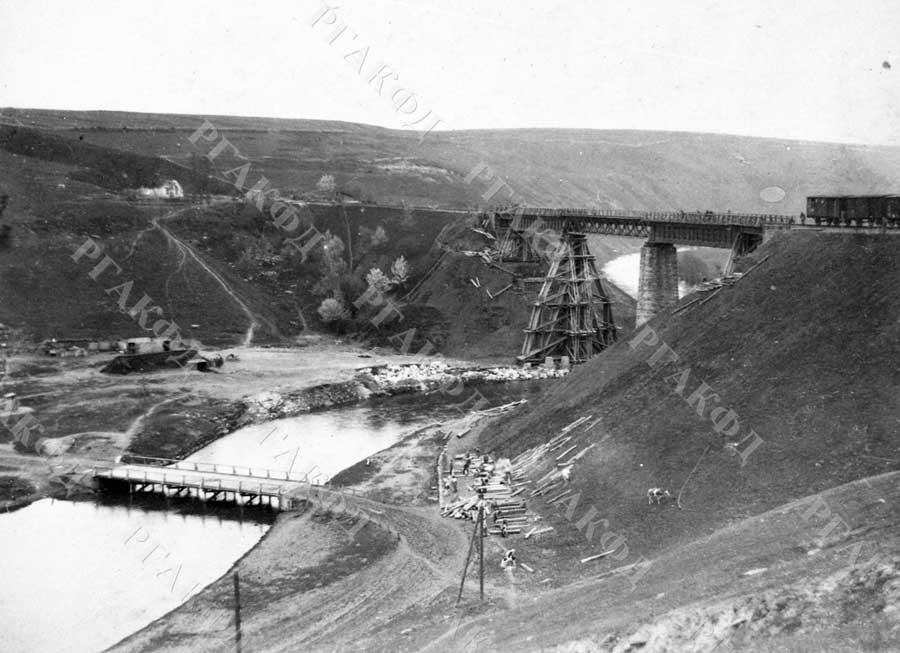 Общий вид местности с железнодорожным и автомобильным мостами через реку. Российская империя. 1914–1918 гг. РГАКФД. Арх. № П-241-ч/б