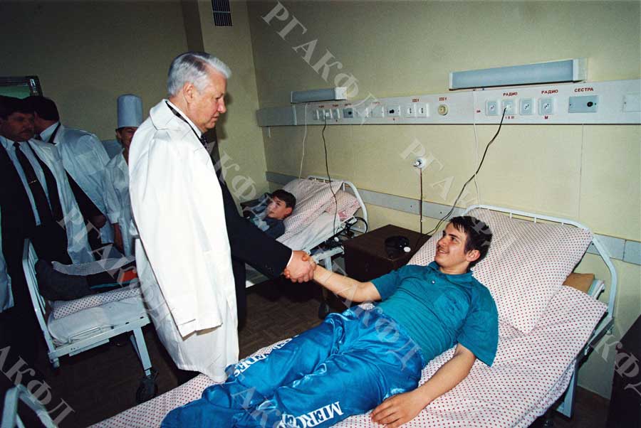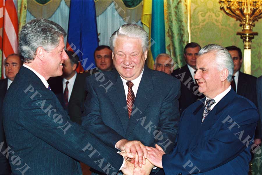 Дружеское рукопожатие Президента РФ Б.Н. Ельцина, Президента США Билла Клинтона и Президента Украины Л.М. Кравчука после подписания американо-российско-украинского заявления о ликвидации ядерного оружия на Украине и о присоединении Украины к Договору о нераспространении ядерного оружия во время официального визита Президента США в Российскую Федерацию.