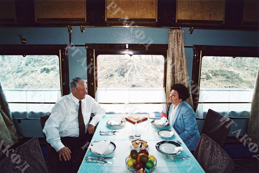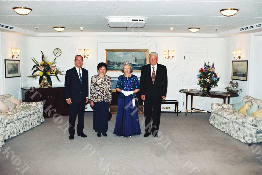 Президент РФ Б.Н. Ельцин с супругой Н.И. Ельциной и Королева Соединенного Королевства Великобритании и Северной Ирландии Елизавета II с супругом Герцогом Эдинбургским на королевской яхте «Британия» во время официального визита королевской четы в Российскую Федерацию.