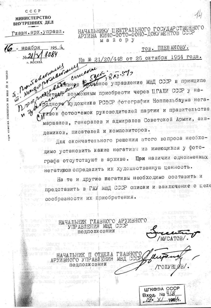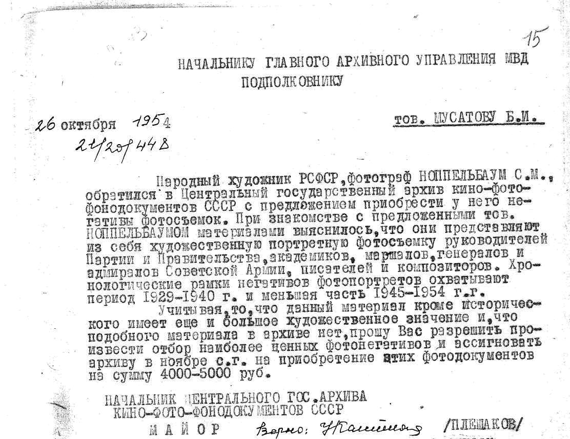«Народный художник РСФСР, фотограф Наппельбаум М.С., обратился в Центральный государственный архив кино-фото-фонодокументов СССР с предложением приобрести у него негативы фотосъемок. При знакомстве с предложенными тов. Наппельбаумом материалами выяснилось, что они представляют из себя художественную портретную фотосъемку руководителей Партии и Правительства, академиков, маршалов, генералов и адмиралов Советской Армии, писателей и композиторов. Хронологические рамки негативов фотопортретов охватывают период 1929–1940 гг. и меньшая часть 1945–1954 гг.
