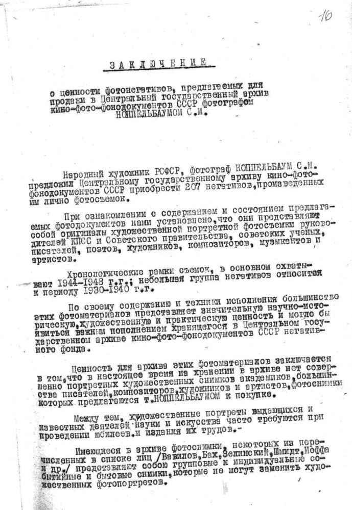 Начальником фотоотдела ЦГАКФФД СССР Ермаковой Н.И. было подготовлено заключение (фото №№ 8–9) о ценности фотонегативов, предлагаемых для продажи в Центральный государственный архив кино-фото-фонодокументов СССР фотографом Наппельбаумом М.С. с поименным списком членов правительства, академиков, ученых, писателей, композиторов и прочих известных людей.