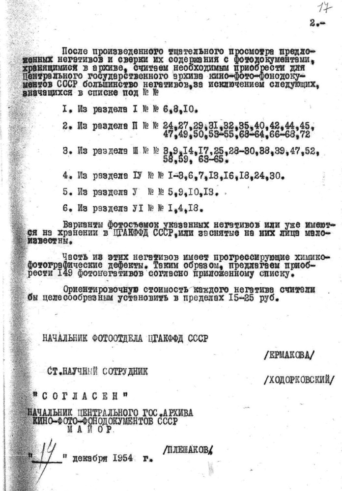 Учитывая, то, что данный материал кроме исторического имеет еще и большое художественное значение и, что подобного материала в архиве нет, прошу Вас разрешить произвести отбор наиболее ценных фотонегативов и ассигновать архиву в ноябре с.г. на приобретение этих фотодокументов на сумму 4000–5000 руб.».