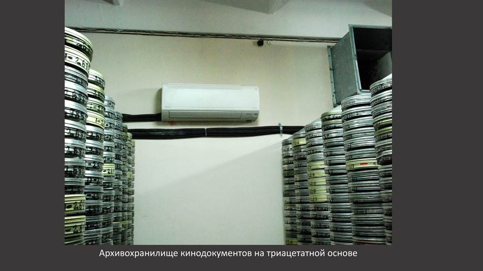 Параллельно с этой проблемой самостоятельно архиву не удается решить вопрос, по той же причине и о переводе кинодокументов с нитроосновы на негорючую триацетатную кинопленку. За 2001-2004 гг. в рамках государственной программы архиву удалось перевести 282 ед.хр. кинодокументов на триацетатную кинопленку. А за 2013-2016 гг. своими силами нам удалось перевести только 25 ед.хр. кинодокументов с нитро на триацететную основу.