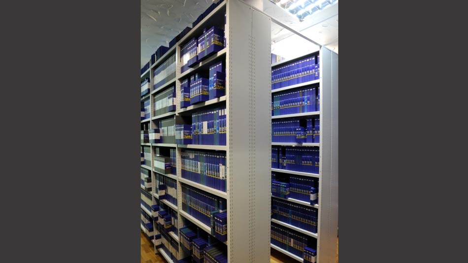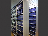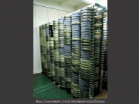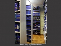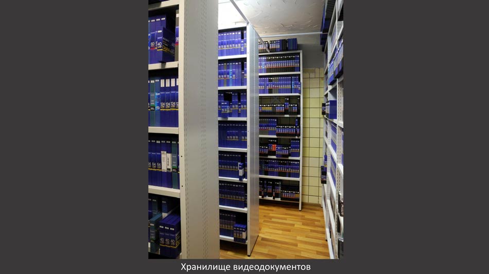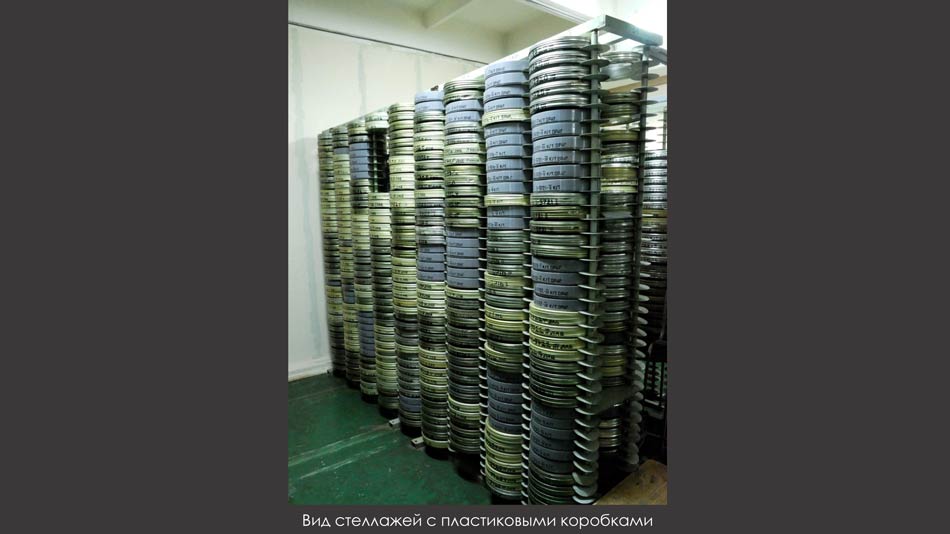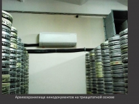Рекомендуемые температурно-влажностные параметры ГОСТов (7.65-92 «Кинодокументы, фотодокументы и документы на микроформах. Общие требования к архивному хранению», ГОСТ 7.68-95 «СИБИД. Фоно и видеодокументы. Общие технические требования к архивному хранению») по хранению кинофотодокументов мы стараемся поддерживать. Для этого в архиве имеются промышленные кондиционеры для кинохранилищ (Слайд 14). В рамках ФЦП «Культура России» в архиве прошли работы по замене кондиционеров в 9-ти этажном хранилище, по замене датчиков и проводов охранно-пожарной сигнализации, по установке специализированных металлических стеллажей для хранения кинодокументов на нитрооснове в подземном хранилище (Слайды 15-16). На сегодняшний день в архиве 9950 пластиковых коробок, предназначенных для защиты кинодокументов от механических повреждений, света, и других воздействий окружающей среды (Слайд 17).