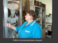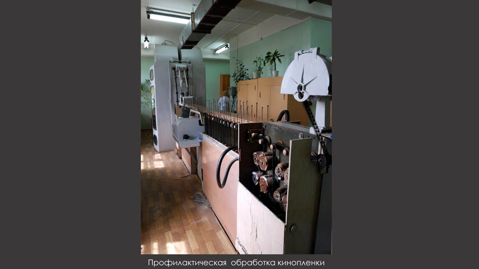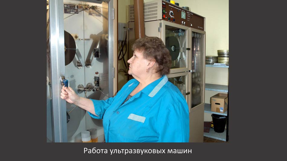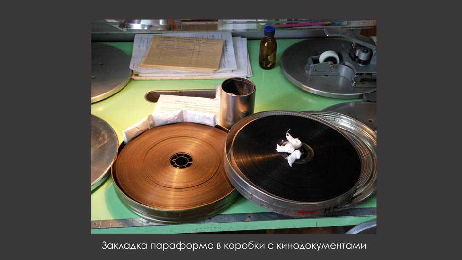 В кинодокументы, пораженные плесенью, закладывается антисептик параформ (таблетированный или порошковый) на срок от 2-х недель до 3-х месяцев (Слайд 18). После обработки параформом, кинодокументы передаются в отдел реставрации на машинную реставрацию (сначала кинодокументы обрабатываются от плесени на ультразвуковой машине перхлорэтиленом (Слайды 19-20), а затем убитая плесень смывается на консервационно-реставрационных машинах А-1 или «Клара») (Слайды 21-24).