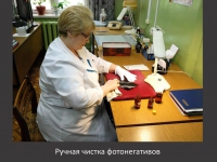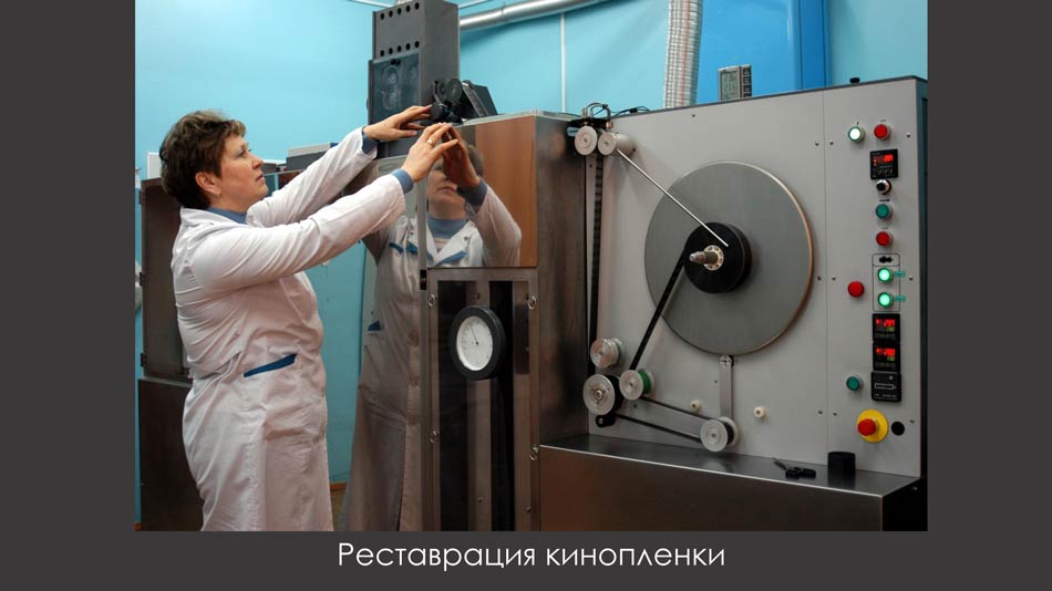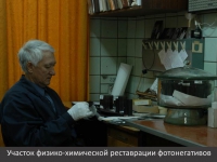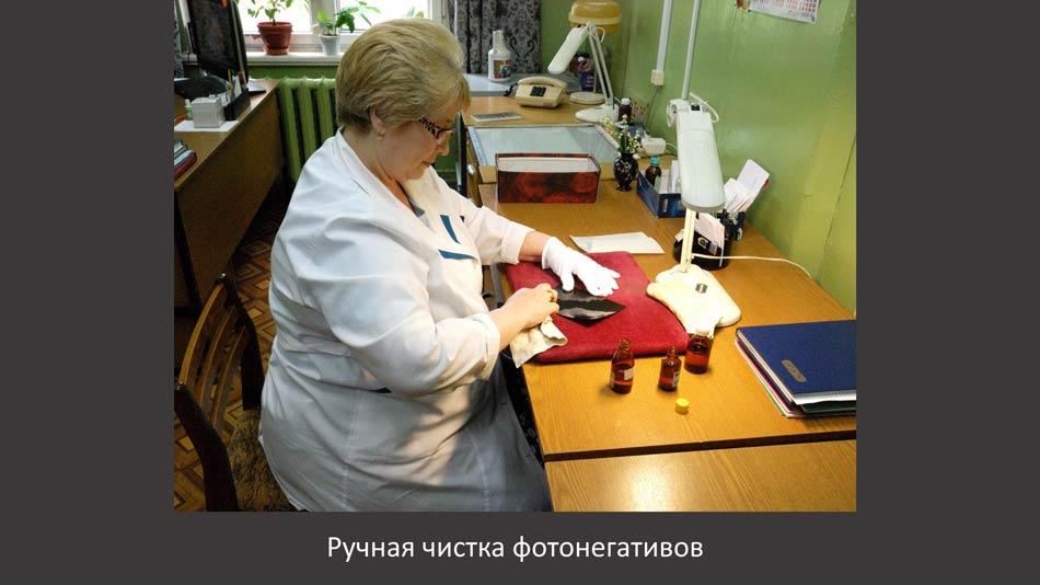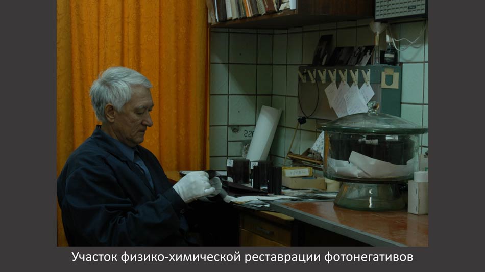 В целях реставрации оригинальных фотонегативов в архиве функционирует участок физико-химической реставрации фотодокументов по методике НИКФИ и методике мастера-реставратора РГАКФД И.М. Карского (Слайды 32-34).