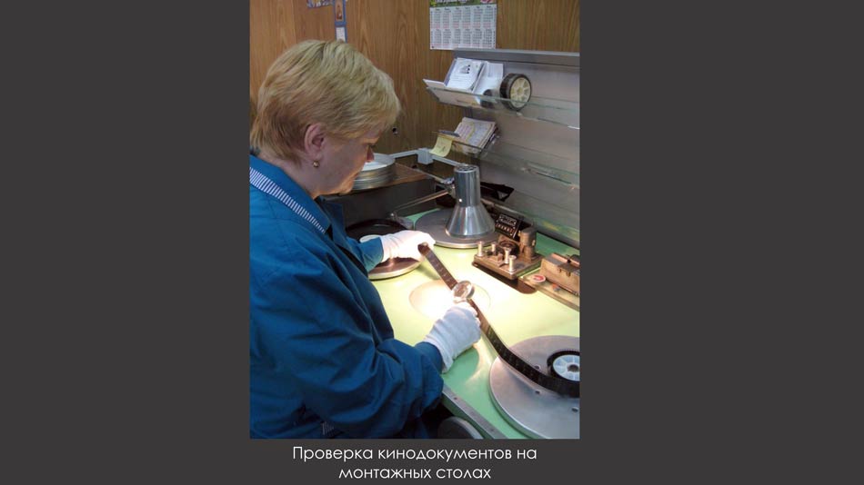 По заключению ОТК для обеспечения физико-химической сохранности кинофотодокументов в архиве проводятся консервационно-профилактические и реставрационные работы. Мы проводим все виды реставрационных работ, которые возможны с кинодокументами; реставрация эмульсионного слоя и основы черно-белых и цветных кинодокументов, консервационную обработку.