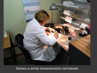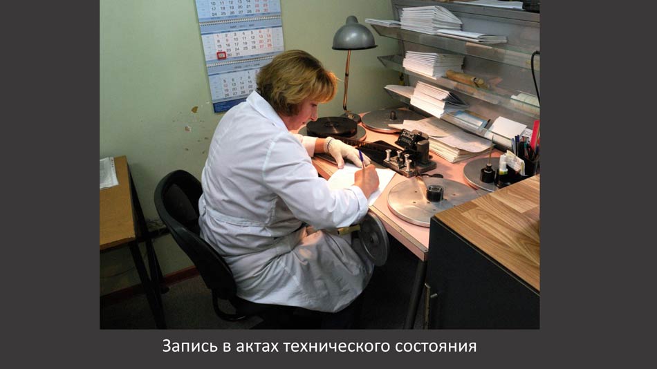 Контроль кинодокументов осуществляется на монтажном столе с выполнением необходимых измерений на контрольно-измерительных приборах: метромере, линейки по определению усадки пленки и др. (Слайды 26-28). Результаты контроля фиксируются в актах технического состояния, куда вносятся сведения о наличии дефектов, дается заключение о необходимости проведения реставрационно-профилактической обработки с указанием вида работ, указывается общее состояние пленки, возможность печати с неё копий, просмотра на звукомонтажном столе или в кинозале.