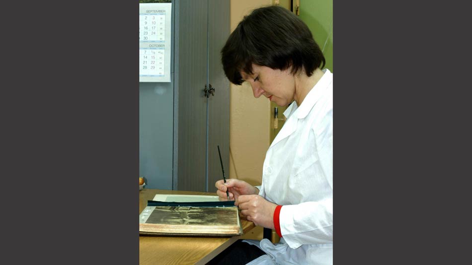 В РГАКФД на хранении находится 10 522 фотоальбома, содержащих 179 168 снимков. Нас постоянно беспокоила сохранность альбомов, которые содержат очень ценную, а зачастую единственную в своем роде информацию. В целях сохранности оригинальных фотоальбомов в архиве проводится контратипирование альбомного фонда и создание дубль-альбомов. В фотолаборатории архива изготовлено свыше 73 тысяч контратипов. При наличии дубль-альбомов исследователям оригинальные фотоальбомы не выдаются.