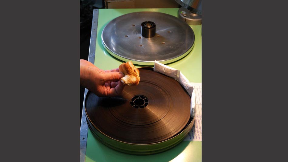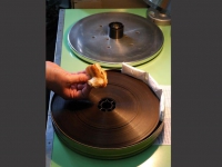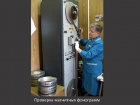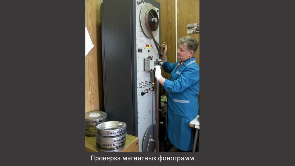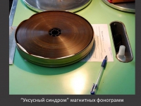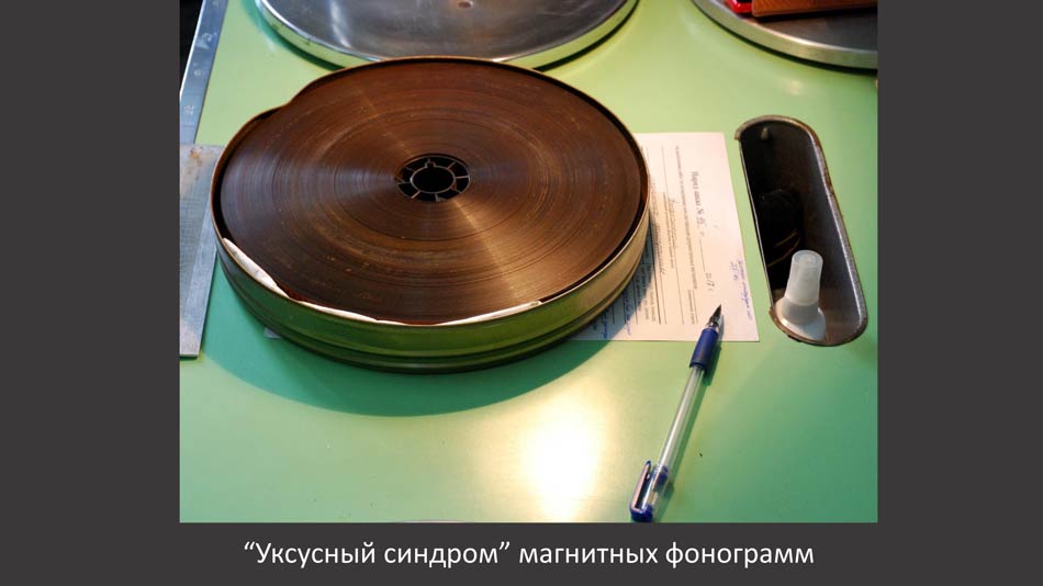 В связи с этим в архиве была разработана специальная программа по работе с магнитными фонограммами. С целью предотвращения заражения кинодокументов парами уксусной кислоты все магнитные фонограммы (их на хранении в архиве – 21 тысяча), были перемещены на 2-ой этаж триацетатного фильмохранилища. Наряду с проведением контроля технического состояния магнитных фонограмм с использованием фильмофонографа (Слайд 35) для определения состояния звука, проводится проветривание коробок и закладка в них поглотителей уксусной кислоты. Эта работа проводится с конца 2000 года. За это время прошли проверку технического состояния все магнитные фонограммы. 44 ед.хр. были выявлены с признаками «уксусного синдрома», эти коробки были переведены на другой носитель (записаны на кассету). На сегодняшний день по результатам последующих проверок нам необходимо ещё оцифровать 429 ед.хр. магнитных фонограмм, шумов/музыки, которые показали наличие «уксусного синдрома» III стадии (осыпание магнитного слоя) (Слайды 36-38). С сентября 2016 года начался четвертый круг проверки магнитных фонограмм.