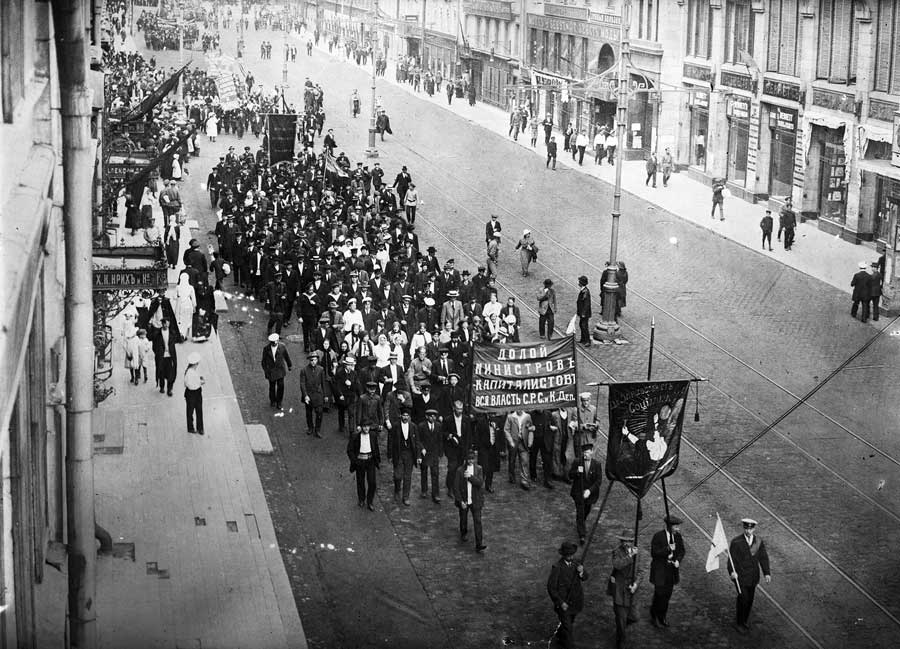 Июньская демонстрация в Петрограде отражена в фотодокументах архива полнее предыдущих событий. На I Всероссийском съезде рабочих и солдатских депутатов было решение о проведении 18 июня демонстрации на Марсовом поле для возложения венков на могилы жертв Февральской революции. Президиум съезда, президиум Петроградского Совета Р. и С.Д. обратились к гражданам Петрограда: «Солдаты, рабочие и все граждане Петрограда! Вместе позвали мы вас на демонстрацию, чтобы свою силу, и мощь, и преданность революции вы противопоставили контр-революции… Придут, быть может, дни когда мы позовем вас на улицу с оружием в руках… Но сегодня мы зовем вас оставить оружие дома. Все должны подчиниться общему решению всех партий. Демонстрация должна быть мирной…»[4] На фотодокументах мы видим колонны демонстрантов на Невском проспекте с лозунгами «Долой министров-капиталистов», «Вся власть Советам рабочих и солдатских депутатов» (фото 8), «Долой десять министров капиталистов»; демонстрацию на Марсовом поле с лозунгами «Долой министров капиталистов», «Власть совету Р.С. и Крест. депутатов!», «Долой десять министров капиталистов», «Николая Кровавого в Петропавловскую крепость!» Фотография П.Оцупа отображает демонстрацию трудящихся (фото 9). Людской поток медленно двигается по Невскому проспекту к Марсову полю. «Руководители большевиков торжествуют. Они указывают на тысячи проходящих знамен, 80 процентов которых испещрены большевистскими лозунгами: «Долой», «долой», «долой».[5] «В Москве манифестация носила мирный характер…Движения демонстрантов к центру не было… Выступают эсеры, меньшевики и большевики. Почти каждый оратор вызывает равные по силе протесты и одобрения...»[6] На фотодокументах митинги у памятника Скобелеву, на улицах города. Известный кинооператор Петр Новицкий выступает как фотопублицист. Он заснял митинг у Страстного монастыря 18 июня 1917.