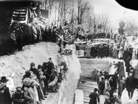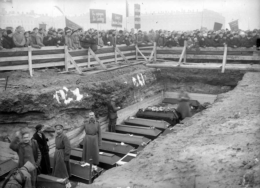 «…Две недели отогревали промерзшую землю и рыли могилы. Потом целый день подносили гробы».[8] (фото 13). На фотодокументах (авторы которых неизвестны): рытье могил, похоронная процессия на Марсовом поле, захоронение. «К этому времени в Российской революционной политической традиции уже сложился обряд «красных похорон». Церемония включала в себя и религиозные обряды и использование революционной символики (красные флаги, революционный похоронный марш)».[9] Церемония нашла свое отражение в фотодокументах: панихида у могил жертв (фото 14), митинг на Марсовом поле во время похорон.