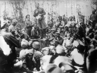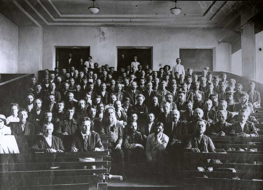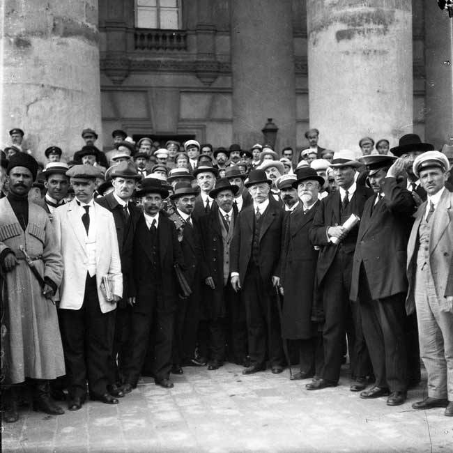 По фотодокументам невозможно понять степень участия в революции крестьянства. Крестьяне на местах обсуждали февральские события. Ценны фотодокументы, освещающие работу Всероссийского съезда крестьянских депутатов, который проходил в Петрограде 4-28 мая. «Торжественно, пышно и даже величаво совершено 4 мая открытие всероссийского совета крестьянских депутатов…»[16]. Фотография «Депутация петроградских полков в Народном доме, прибывшая приветствовать открытие Всероссийского съезда крестьянских депутатов» подтверждает эти слова. На фотодокументах общий вид зала заседания съезда (фото 23), делегаты съезда, портрет Председателя Всероссийского Крестьянского съезда Н.Д. Авксентьева, группа членов исполнительного комитета съезда, группа членов организационного комитета съезда: В.М. Чернов, В. Фигнер, Н. Чайковский и др. Всероссийский съезд избрал исполком Всероссийского Совета крестьянских депутатов. Группа членов исполнительного комитета: Н.Д. Авксентьев, А. Гоц, М. Натансон, В. Ракитников, Н. Русанов, Г. Фирсов, Н. Чайковский, В.М. Чернов.