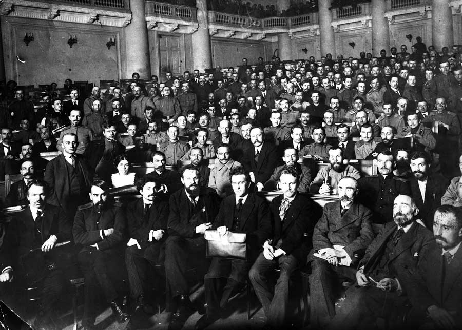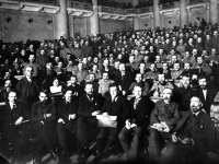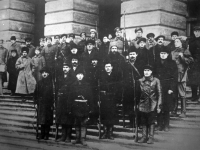 17-22 октября 1917 года в Петрограде проходила Всероссийская конференция фабрично-заводских комитетов. На фотографиях группа делегатов 1-й Всероссийской конференции фабрично-заводских комитетов. В группе Л. Троцкий, Н. Скрыпник (17 октября 1917).Автор данных снимков Яков Штейнберг – один из немногих профессионалов, оставивших воспоминание о свей работе в 1917 году. Накануне октябрьских дней ему удалось сделать редкий кадр: «… я заснял в Смольном большое собрание делегатов фабрично-заводских комитетов, принявших решение об участии рабочих в вооруженном восстании».[19]