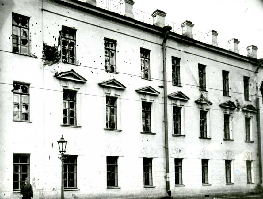 Я.Штейнберг, вспоминая о своей работе в 1917 году, пишет: «26 октября направляюсь в Смольный за получением мандата на право фотосъемок. Новый мандат я получил в тот же день к концу дня… Утром 27 октября я «обработал» все окружение Смольного: проверка пропусков у входа, вооруженную пулеметами охрану подъезда, «Лейтенант Шмидт» – броневик с большой группой красногвардейцев на нем. 1 ноября заснял здание Владимирского училища. Оставшиеся в нем юнкера не сдавались, несмотря на предложение освободить помещение. Они сдались после артиллерийской осады».[20] На фотографиях Я. Штейнберга «Пикет Красной гвардии проверяет пропуска у входа в Смольный» (Петроград, 27 октября 1917), «Вид Владимирского военного училища после артобстрела» (Петроград, 1 ноября 1917) (фото 33), «Патруль красногвардейцев на улице Петрограда греется у костра» (Петроград, октябрь 1917).