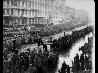 Важнейшей и самой крупной манифестацией после Февраля явились похороны жертв революции в Петрограде 23 марта. «…Медленно со всех концов города движутся процессии с гробами жертв, с развевающимися флагами, с несметной толпой народа. Медленно, торжественно раздается в воздухе согласное пение тысячи голосов: – Вы жертвою пали в борьбе роковой…»[7] (фото 10). Репортажные кадры Петра Оцупа показывают траурную процессию на Невском, митинг на Марсовом поле, похороны жертв. Улицы и площади бурлившего Петрограда стали для него съемочным павильоном. Петроградские фотографы снимали трупы жертв в Обуховской больнице, вынос тел из Обуховской больницы, траурные процессии на улицах Петрограда (фото 11), членов Временного правительства (фото 12), студентов Академии художеств, рабочих заводов на похоронах, солдат и милицию в ожидании траурной процессии, венки у могил, митинг на Марсовом поле.