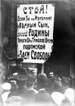 18 июня Временное правительство начало заранее обреченное на неудачу наступление на Западном фронте. Правительство использовало все средства для пропаганды войны. В Петрограде проходили манифестации в связи с наступлением русской армии. В Москве в дни наступления состоялся митинг у Александровского училища. Союз георгиевских кавалеров проводил митинги на Страстной площади. Юнкера Алексеевского училища записывались в армию в дни июньского наступления. В Каменец-Подольске прошла демонстрация в связи с наступлением русских войск. Временное правительство пышно обставляло проводы воинских частей на фронт. Фотодокументы показывают крестный ход и молебен на Красной площади перед отправкой на фронт, смотр полков, сформированных из беженцев и возвращенных из плена перед отправкой на Западный фронт, проводы на фронт женского «батальона смерти» (благословление на Красной площади патриархом Тихоном, принятие присяги и вручение знамени батальону). На фронте также шла агитация. На фотографии Я. Штейнберга запечатлена агитация солдат 1-го армейского корпуса за наступление на Западном фронте под Двинском (фото 21). Каково же было действительное положение на фронте, в фотодокументах не отражено.