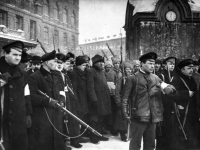 Большое значение имеют фотодокументы о создании Красной гвардии, боевых дружин, рабочей милиции. В дни революции отряды Красной гвардии создавались по производственному признаку – по предприятиям. На фотографиях группы красногвардейцев заводов Барановского, Б. Вишера, «Треугольник», Трубочного, отряды Красной гвардии в Гельсингфорсе, на Дворцовой площади (фото 26), красногвардейцы на броневике на Красной площади. Обязанности народной милиции были различны – разоружение полиции, арест высших административных лиц и т.п. Фотодокументы показывают милицию на улицах Москвы и Петрограда, летучий отряд по борьбе с полицией, патруль народной милиции ведет переодетых городовых в Петрограде (фото Я. Штейнберга) (фото 27).