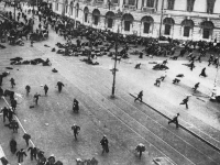 Вскоре за провалом июньского наступления последовал новый взрыв народного возмущения политикой Временного правительства – июльская демонстрация в Петрограде. Это событие слабо освещено в фотодокументах. На фотопленке зафиксированы лишь некоторые моменты: вид Литейного проспекта 3 июля, снимок В. Буллы, который навсегда вошел в историческую фотолетопись революции, «Расстрел рабочей демонстрации на углу Садовой ул. и Невского проспекта 4 июля 1917 года» (фото 28), эсминец «Орфей», прибывший в Петроград с делегацией Центробалта 5 июля 1917, войска V-й Армии, прибывшие для разгрома большевиков на Дворцовой площади, солдаты у особняка Кшесинской, широко известный снимок Я.Штейнберга «Разгром юнкерами редакции газеты «Солдатская Правда» во дворце Кшесинской», похороны казаков, убитых во время июльского выступления рабочих и солдат 14 июля 1917. «Сегодня по распоряжению Временного Правительства, приступлено к разоружению частей, подлежащих расформированию за вооруженное выступление…Местом для сдачи оружия назначена Дворцовая площадь, вход на которую по-прежнему охраняется казачьими патрулями… Первым стал доставлять оружие Первый пулеметный полк. Оружие принимали правительственные войска и складывали пулеметы и винтовки вокруг Александровской колонны.»[17] Этот факт так отражен в фотодокументах: отряды казаков на Дворцовой площади 8 июля 1917, сдача оружия на Дворцовой площади 8 июля 1917 и репортажный снимок Я. Штенберга «Солдаты 1-го пулеметного полка, разоруженные Временным правительством за участие в июльских событиях» 8 июля 1917 (фото 29).