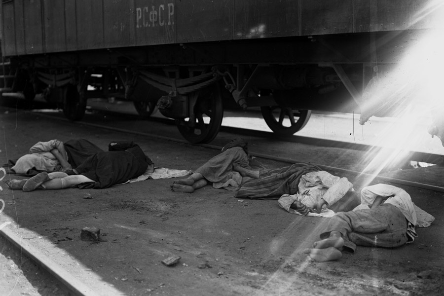 Нет никаких сомнений, что данная группа беженцев терпела большие лишения, страдала от болезней и нехватки продовольствия, однако сила визуального воздействия данного материала уступает той, что ощущается при просмотре кинофотодокументов, связанных с голодом в Поволжье в 1921–1922 годах. В результате проводимой большевиками продразверстки, а также последствий Гражданской войны уже осенью 1920 года в ряде губерний были зарегистрированы случаи массового голодания населения. Затем последовала засуха 1921 года. Пик бедствия пришёлся на осень 1921 – весну 1922 годов. Голод охватил 35 губерний. Люди покидали дома – вначале отъезжали недалеко и ненадолго, выменивали вещи на еду и возвращались с продовольствием к семьям, однако такие поездки становились всё менее успешными. Голод охватывал новые территории. И тогда бегство из деревень приняло массовый характер. К сожалению, часто и оно не спасало – многих смерть настигала в дороге. На железнодорожных станциях возле вагонов можно было увидеть обессиленных людей. А на кладбищах – тела, сваленные в кучу, приготовленные для захоронения в общей могиле, как, например, на фотографии, сделанной в конце 1921 года в Бузулуке, уездном городе Самарской губернии. Всего эта трагедия унесла жизни около 5 миллионов человек. Но помощь пришла. Для спасения населения от голода государством были мобилизованы все силы. 18 июня 1921 года была образована Центральная комиссия помощи голодающим (ЦК Помгол), подобные комиссии создавались и на уровне губерний, уездов, волостей. Советское правительство обратилось к иностранным государствам, заявив, что примет любую помощь, из каких бы источников она ни поступала. Советское правительство обратилось и к собственным гражданам, в том числе к крестьянам из непострадавших от голода районов, с призывом помочь. Были налажены поставки продовольствия – в Россию, в голодающие губернии, в лагеря беженцев. Заработали столовые и детские приюты, организованные советскими учреждениями и иностранными организациями, начали движение питательно-лечебные поезда.