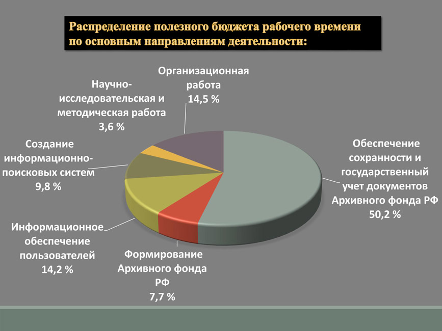 Полезный бюджет рабочего времени по основным направлениям деятельности архива распределился следующим образом (слайд 14):