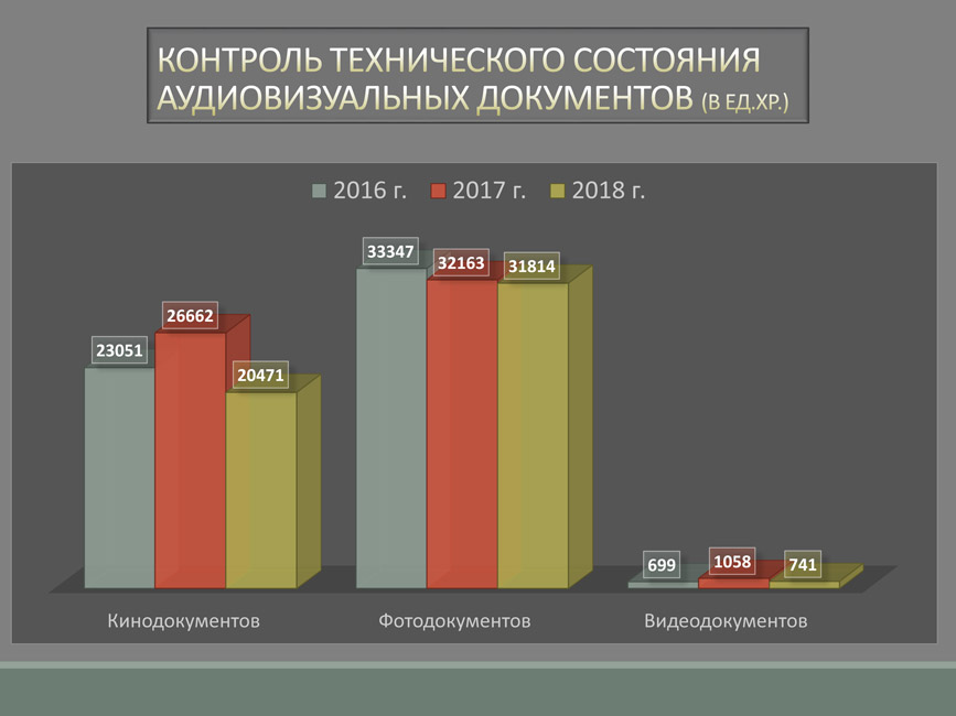 В рамках этого направления осуществлялся контроль технического состояния аудиовизуальных документов (слайд 15). За год проверено КД – 20 471 ед.хр., ФД – 31 814 ед.хр., ВД – 741 ед.хр.
