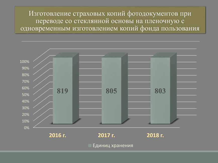В порядке проведения работ по созданию страхового фонда и фонда пользования проводились изготовление страховых копий 803 ед.хр. фотодокументов на стеклянной и пленочной основах с одновременным изготовлением копий фонда пользования (слайд 17).