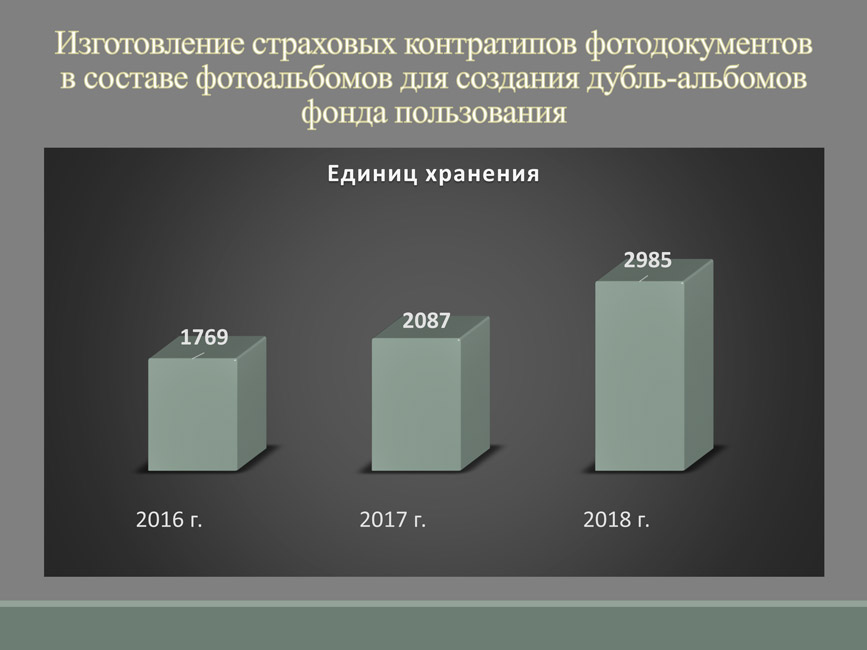 Изготовлены страховые контратипы на 2985 снимков в составе фотоальбомов (слайд 18). С целью создания на каждый альбом дубль-альбома было принято решение эту работу ускорить и, в прошедшем году данный вид работы осуществлялся двумя способами: через репродукционную установку и методом сканирования.