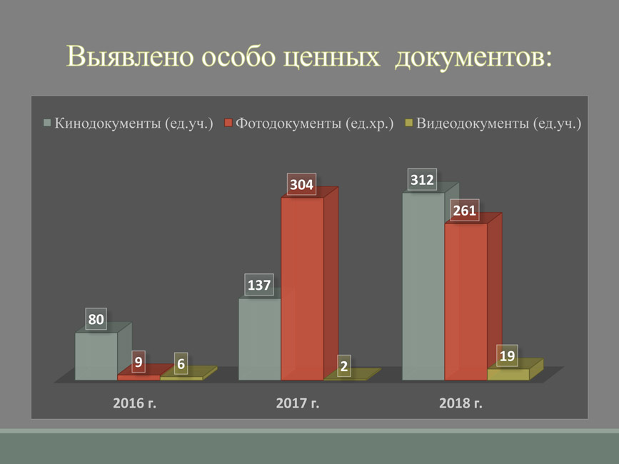 Эта работа ведется постоянно и планомерно. Ежегодно просматривается более 1700 ед.хр. кинодокументов, 1500 ед.хр. фотодокументов, 150 видеодокументов. Количество выявленных особо ценных документов из запланированного массива предсказать невозможно.