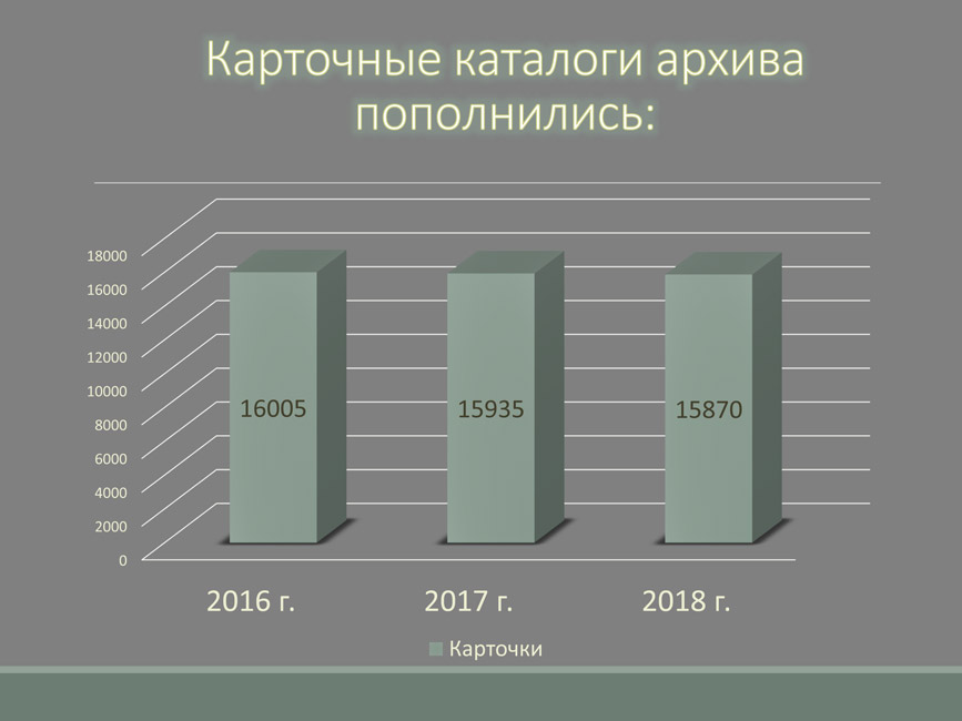 Традиционные карточные каталоги архива пополнились за год на 15 870 карточек (слайд 34).
