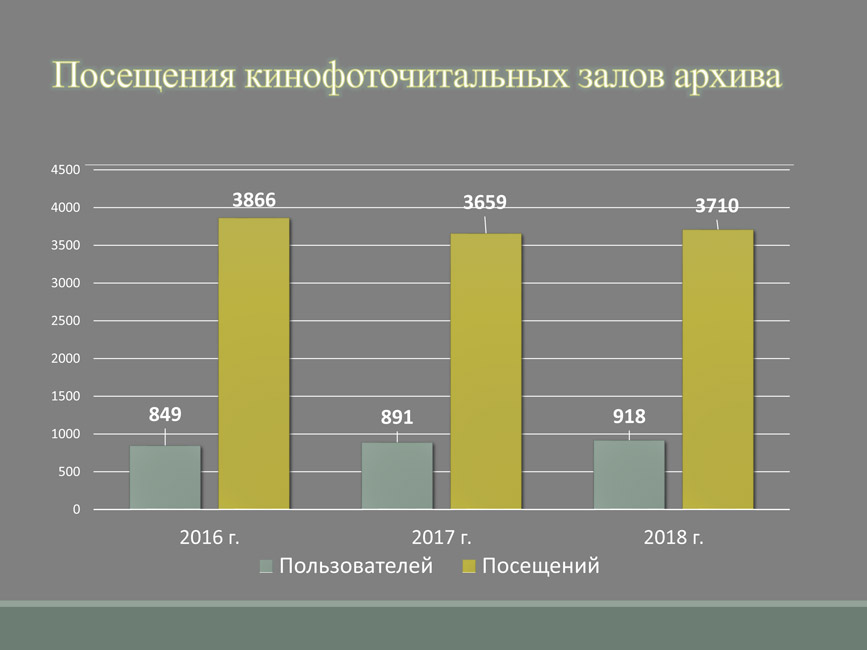 В читальных залах (слайд 37) работали 918 пользователь (3710 посещений), из которых 123 зарубежных пользователя (241 посещение). В следующем году архив ждет значительное увеличение количества пользователей в читальных залах архива, прежде всего, это будет связано с празднование 75-летия Великой Победы.