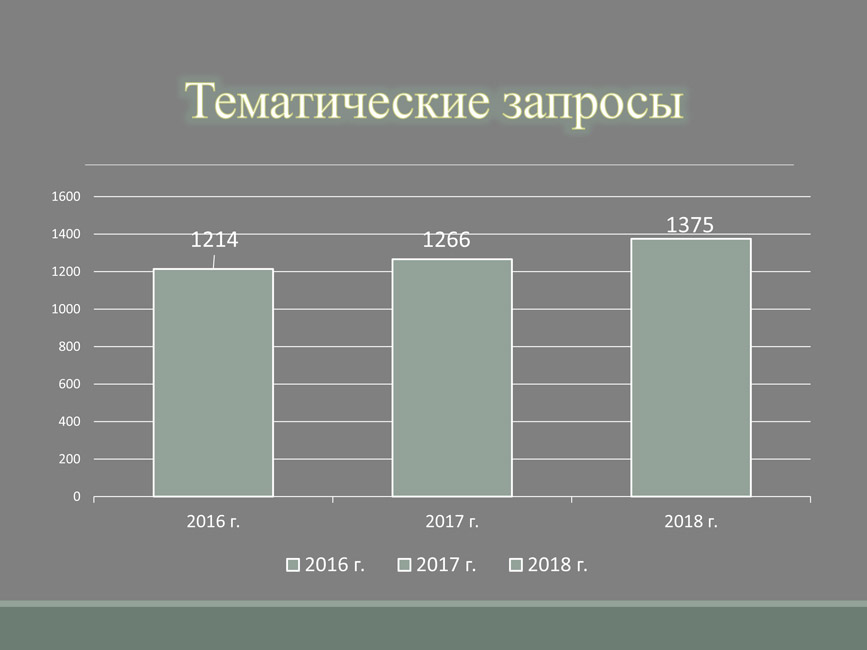 Сохраняется тенденция сокращения количества посещений пользователей в архив, но ежегодно увеличивается количество тематических запросов. В 2018 г. их поступило 1375 (слайд 38).
