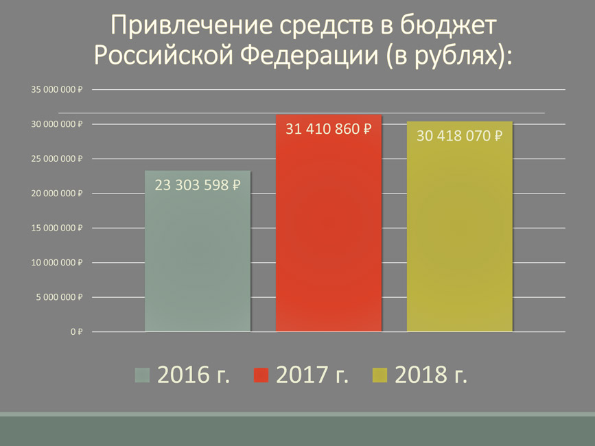 Привлечено в бюджет РФ 30 млн. 800 тыс. руб. (по плану – 27,600 млн. руб.) (слайд 39).